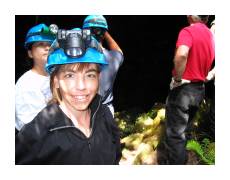 | The next day, we were able to get on a limited attendance tour of the Wild Lava Tube. It's not mentioned on the park's home page, but our guide book (Big Island Revealed) clued us in. All it costs you is 4 AA batteries for the helmet light. Unlike the more accessible Thurston Lava Tube, for this one you start by climbing down a 15 foot metal ladder. Inside you get to see some wonderful features that have all been broken off and cleaned out of the Thurston tube. Highly recommended! | ||