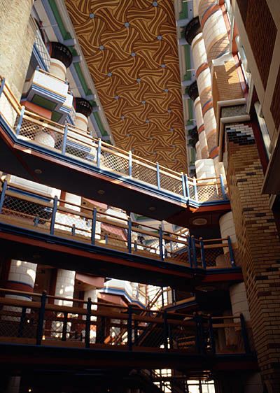The result is a striking and inexpensive decorated ceiling, produced for a cost that is less that the cost of the roughly 400 door handles in the building.
