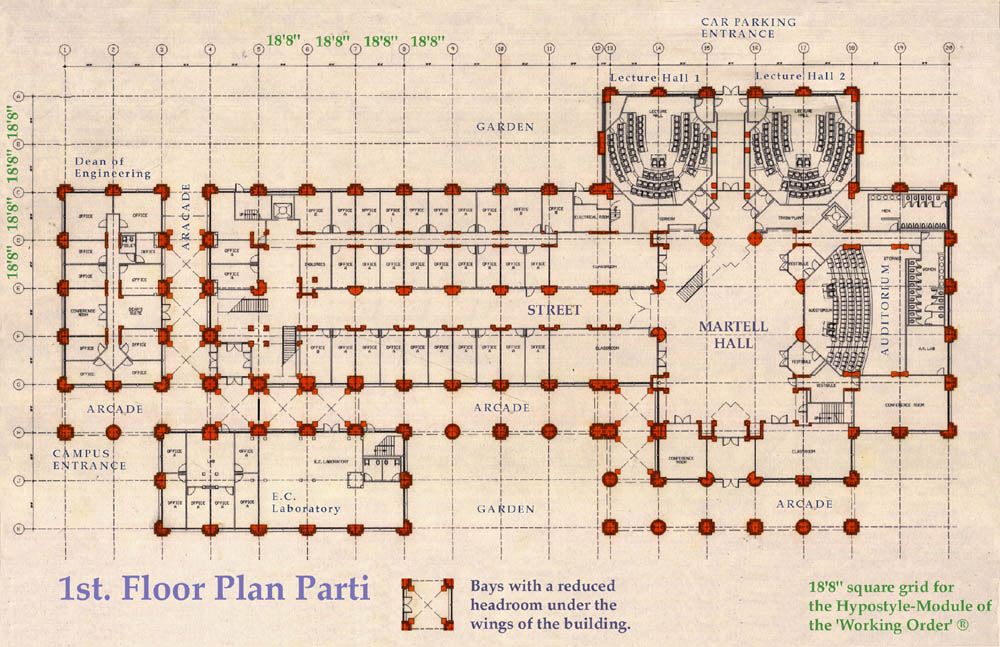 Duncan Hall is laid out on a regular grid of columns,