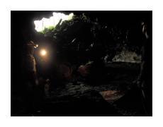 | The next day, we were able to get on a limited attendance tour of the Wild Lava Tube. It's not mentioned on the park's home page, but our guide book (Big Island Revealed) clued us in. All it costs you is 4 AA batteries for the helmet light. Unlike the more accessible Thurston Lava Tube, for this one you start by climbing down a 15 foot metal ladder. Inside you get to see some wonderful features that have all been broken off and cleaned out of the Thurston tube. Highly recommended! | ||