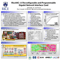 A poster on the RiceNIC was created for the Rice ECE Corporate Affiliates Day on September 7th, 2006. The poster shows the NIC, FPGA architecture, FPGA device utilization and placement map, and the NIC throughput on a TCP streaming test for a variety of packet sizes.