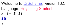 Beware! The insertion caret (the focus point for typing) must be placed after the space following the last ``>'' in the window; otherwise, DrScheme won't let you type a new expression. You can still select old expressions and results for copying, but they cannot be modified.After typing a Scheme expression, type ENTER (a.k.a. RETURN). If you type a number, DrScheme echoes the number back. If you type a more complex expression, DrScheme prints the expression's value. For example, evaluating (+ 5 5) in DrScheme looks like this:
