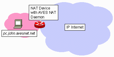 The above steps are all that is needed for a NAT user to take advantage of AVES. The rest of the complexity is completely handled by the AVES service provider. The figure above depicts a NAT user, John, who has signed up for the AVES service. He has one computer behind NAT, it has the host name pc.john.avesnet.net.