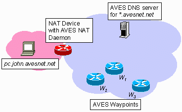 1. Hosts behind NAT gateways do not have globally unique IP addresses, they only have so-called reusable-IP (aka private-IP) addresses, which are not globally unique. Thus, the first function of AVES is to provide host names (e.g. pc.john.avesnet.net) to hosts behind NAT so that they can be uniquely identified. When a NAT user signs up for the AVES service, he simply chooses the names for his hosts and informs the AVES service provider of these choices.