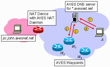 4. Consider the figure above. When any Internet host A wishes to communicate with an AVES host, e.g. pc.john.avesnet.net, A simply performs a host name lookup (arrow (1)). When the AVES domain name server receives this lookup request, it contacts one of the AVES Waypoints, in this case W1 (arrow (2)), to set it up. A confirmation is then received from W1 (arrow (3)). Finally, the AVES domain name server returns the IP address of W1 to A (arrow (4)).