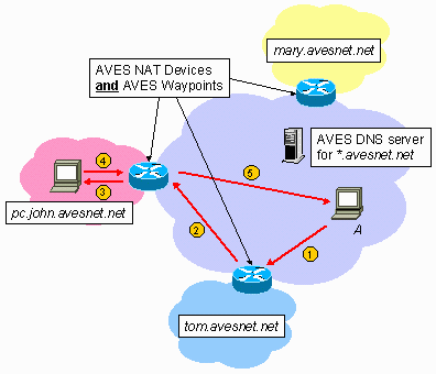 The figure above illustrates the peer-to-peer deployment model of AVES. Comparing it to the figures in the How Does AVES Work? section, notice that the service provider's dedicated waypoints are eliminated. Instead, each AVES user's NAT gateway device is now a waypoint in the system. The AVES service provider still provides the host naming functionality and the control path coordination, but the data path resources are completely contributed by the AVES users themselves. In our simple example, there are three AVES users shown, John, Mary, and Tom, and we show how Internet host A connects to host pc.john.avesnet.net that is behind NAT by sending traffic through the waypoint contributed by Tom.