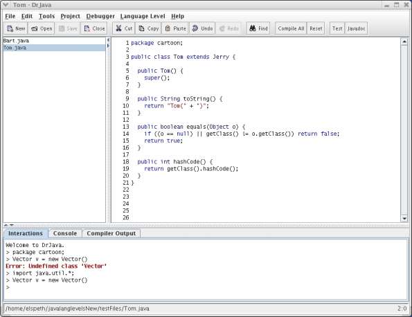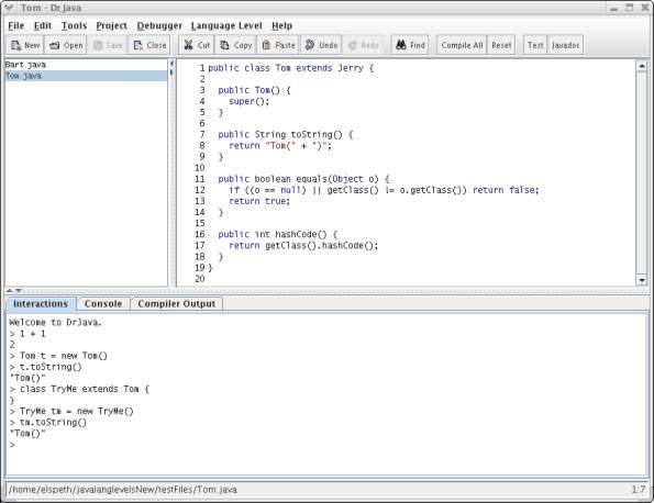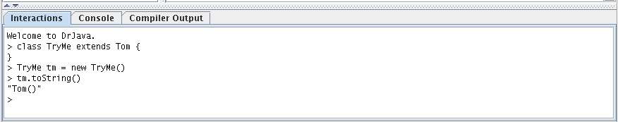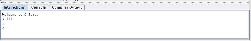 The Interactions Pane is one of the best and most distinctive features of DrJava. It offers both beginning students and more experienced programmers the ability to quickly try out code without having to write cumbersome main methods.